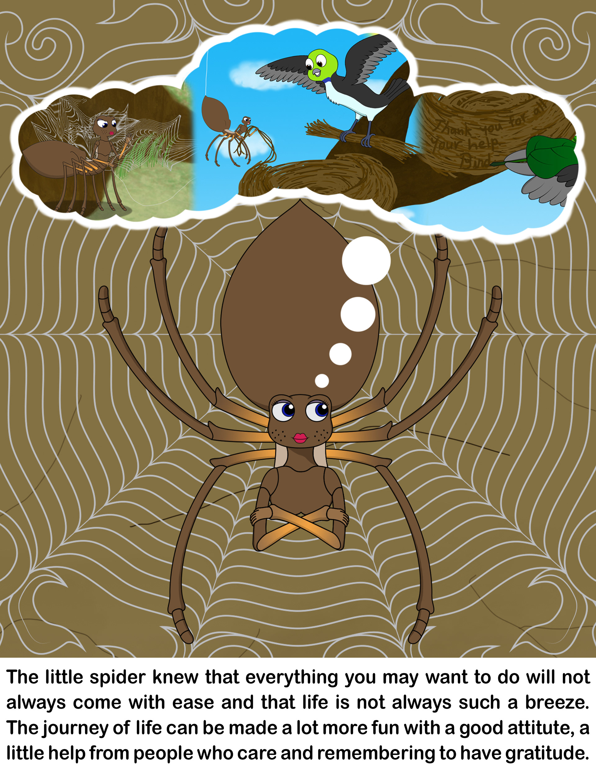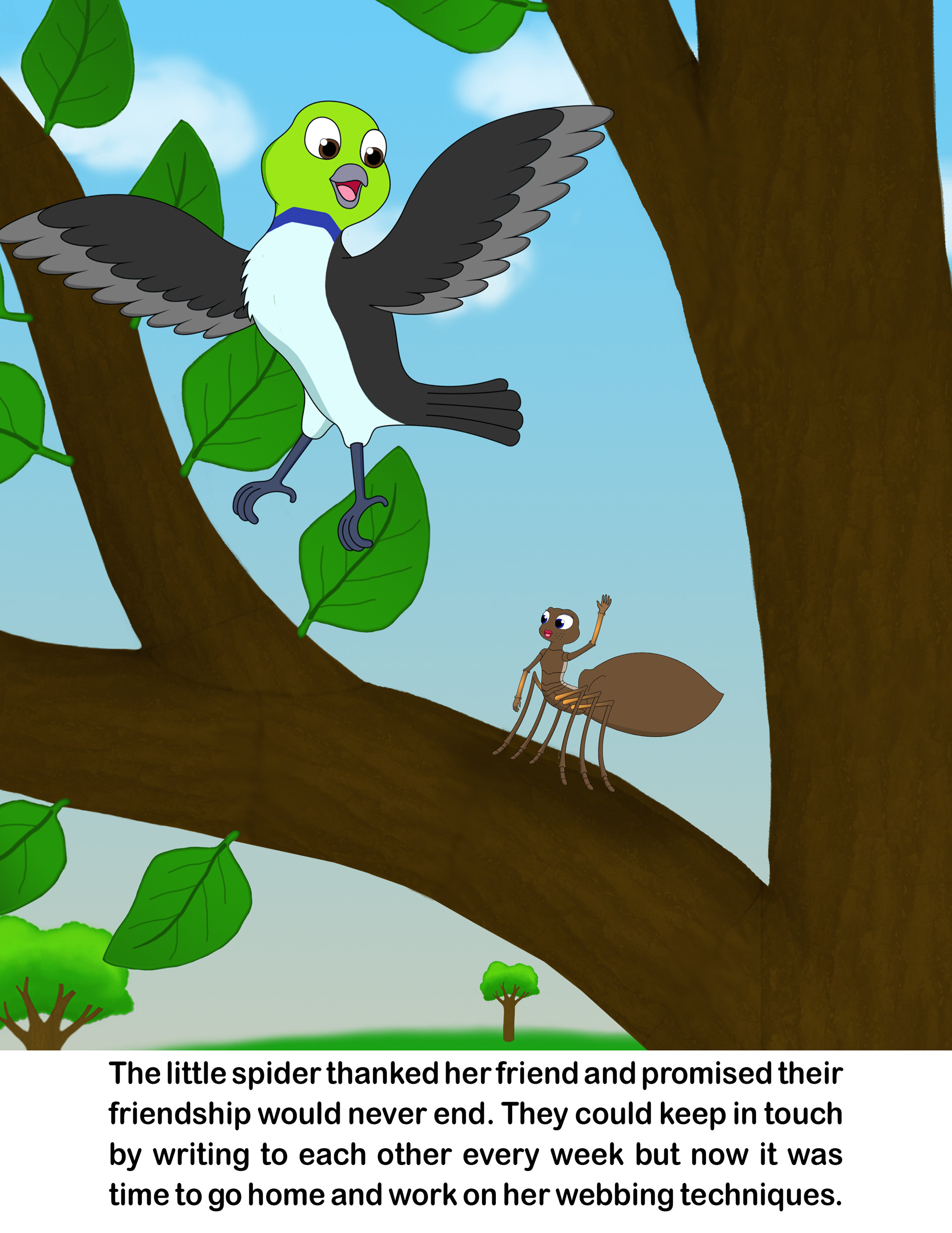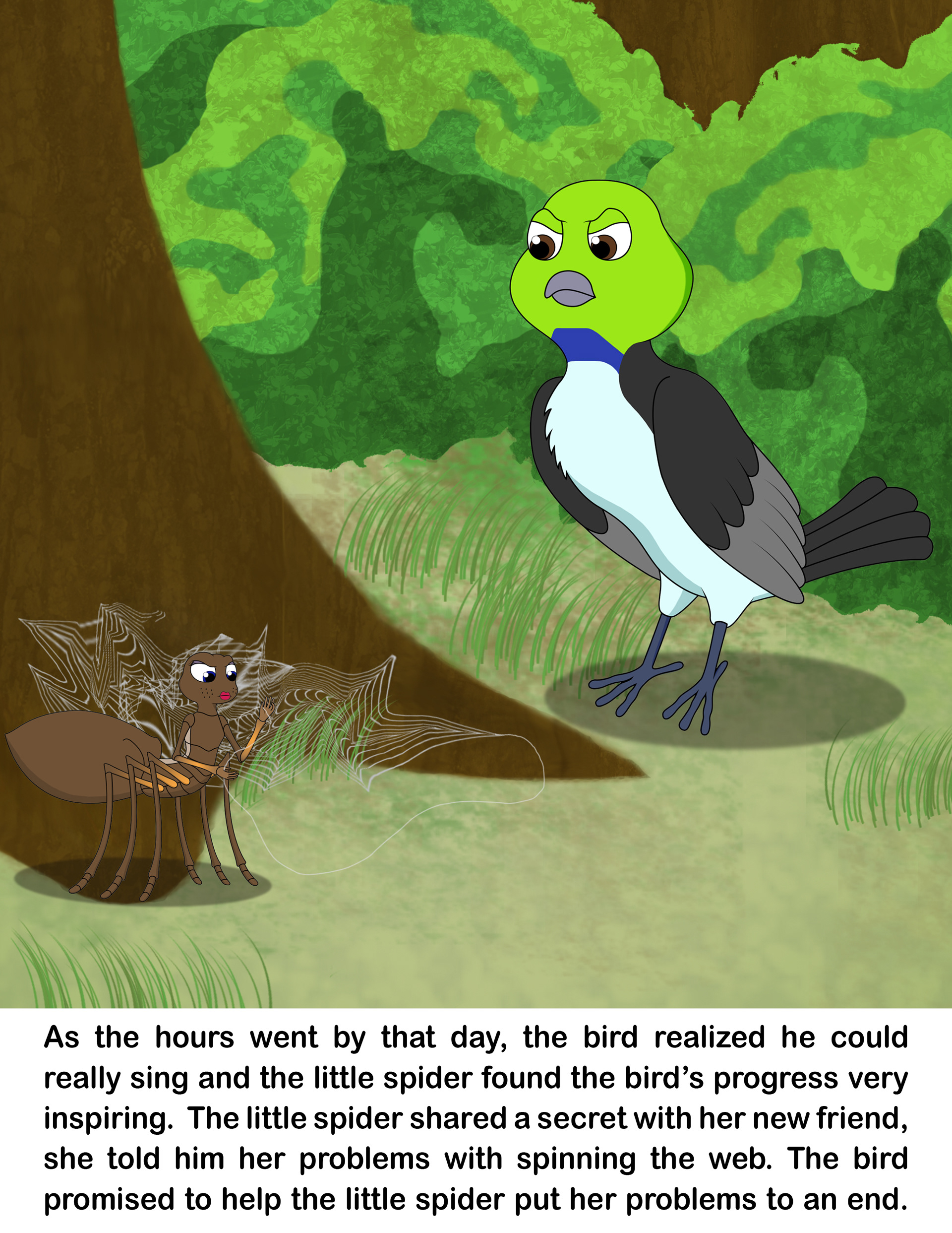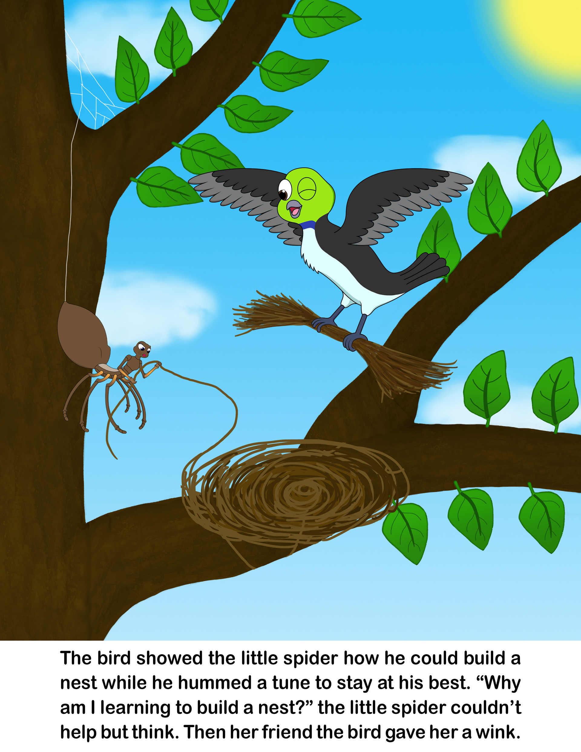 Created and illustrated all the characters in the story. The plot is based on a spider and a bird who help one another by learning how to solve each other's problems by becoming good friends.