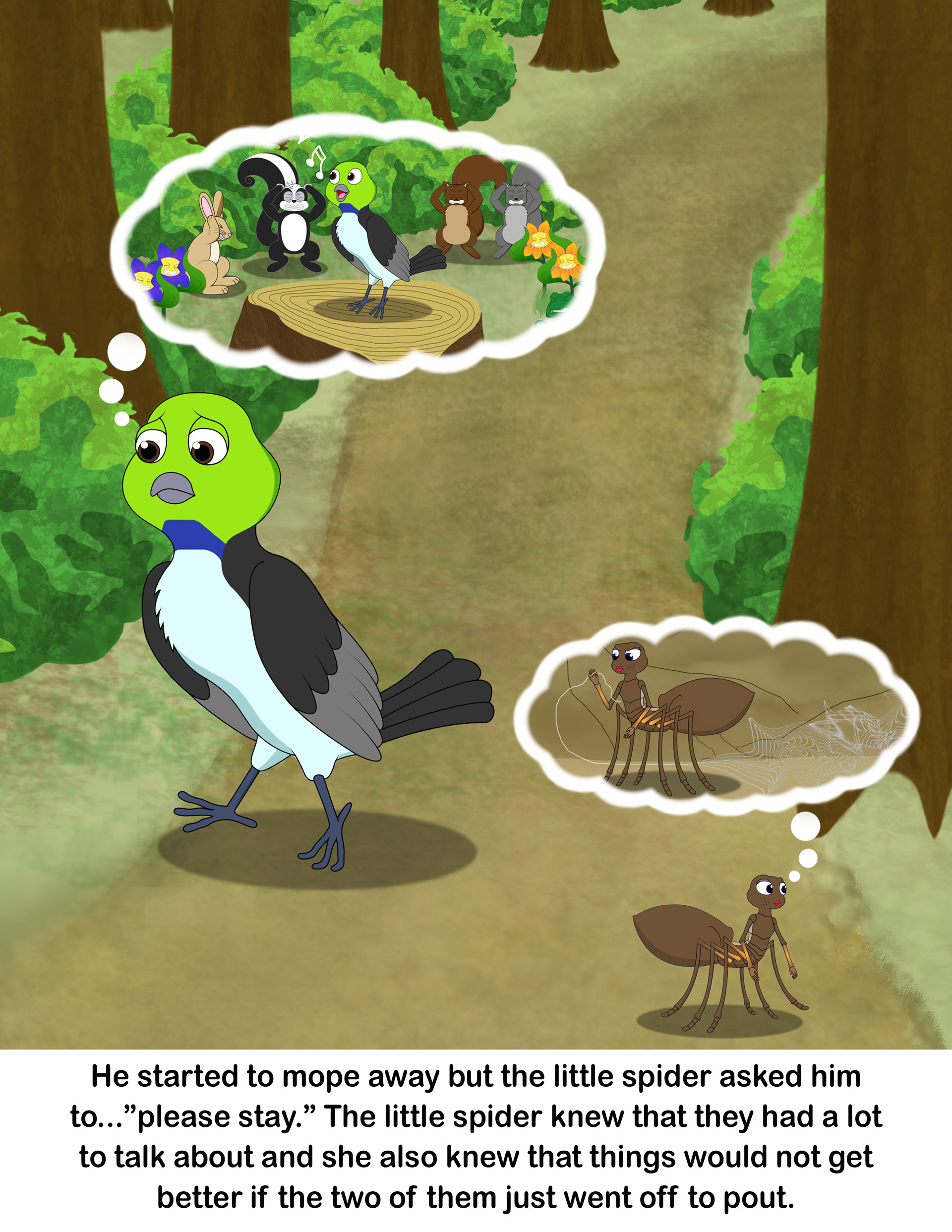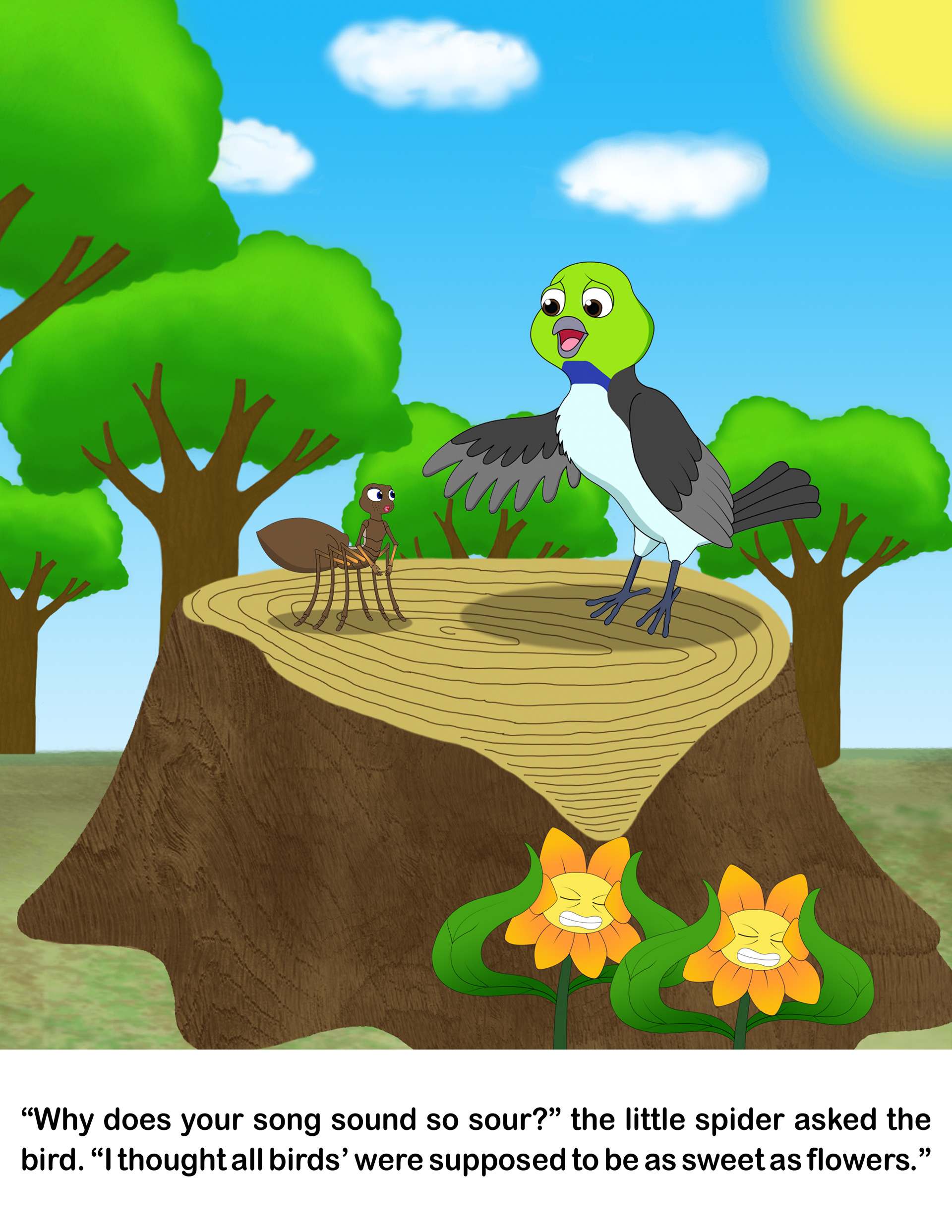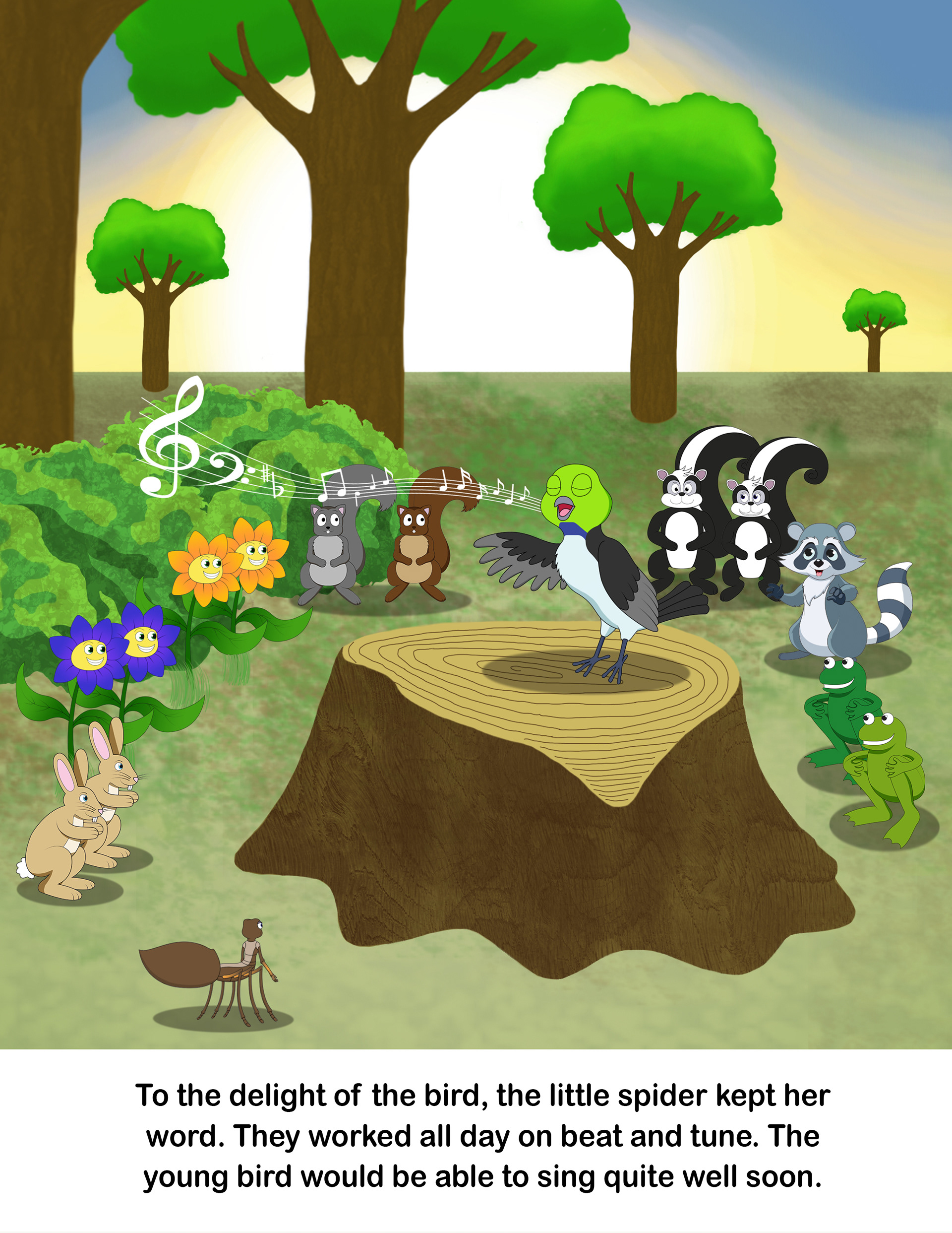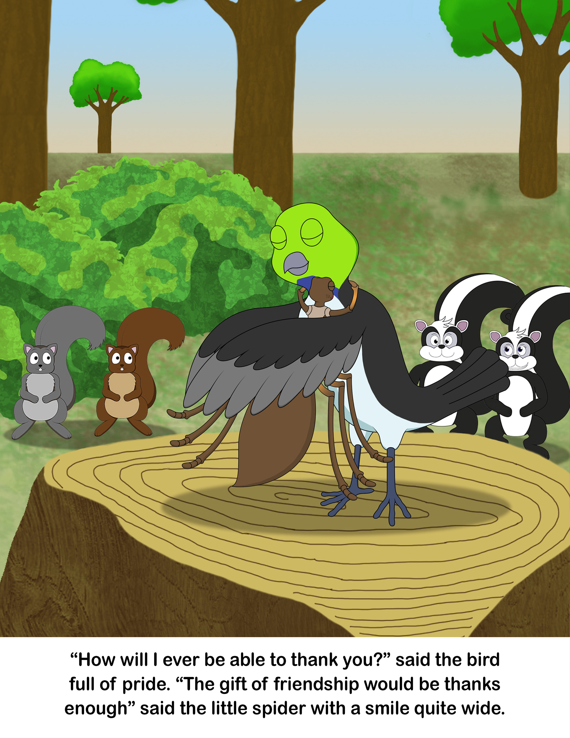 Created and illustrated all the characters in the story. The plot is based on a spider and a bird who help one another by learning how to solve each other's problems by becoming good friends.