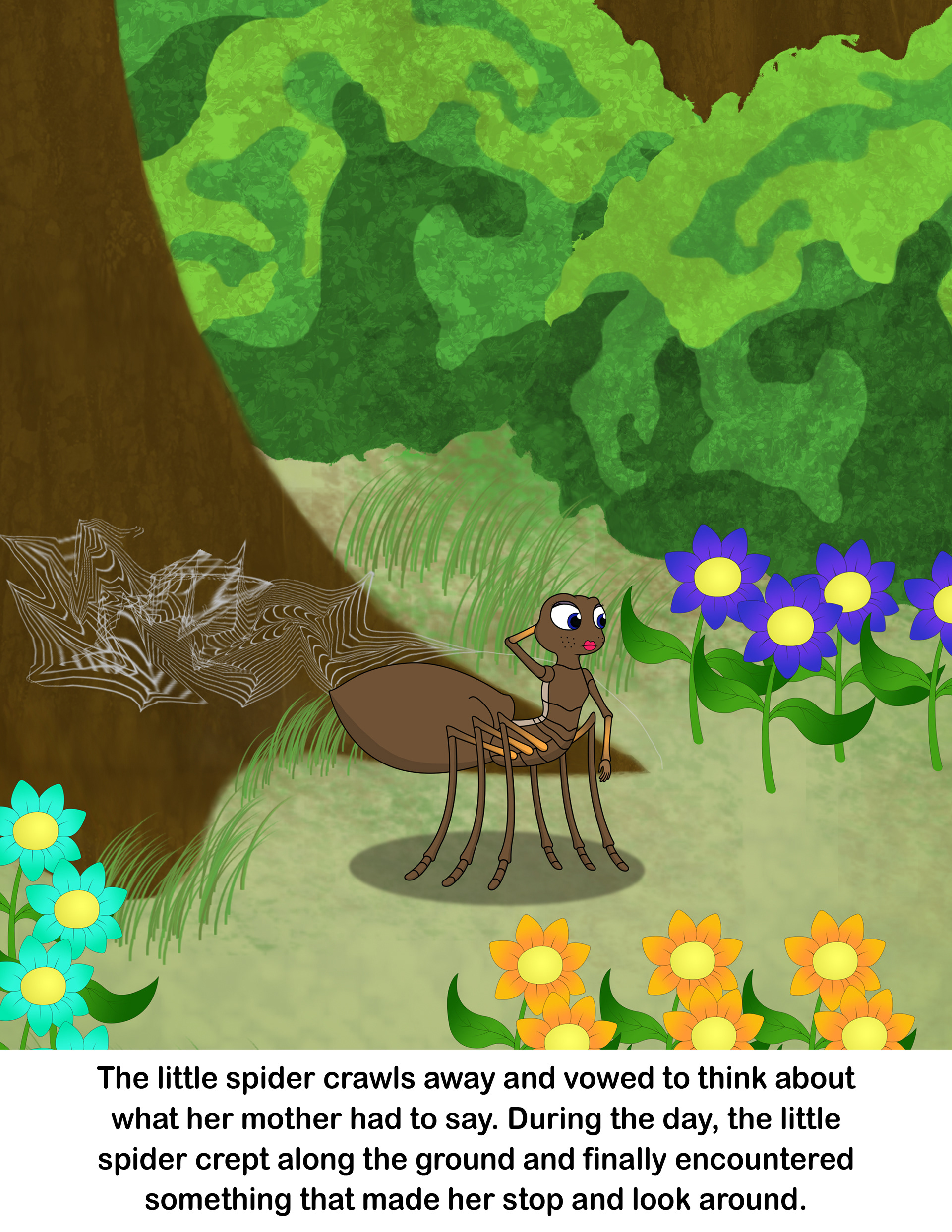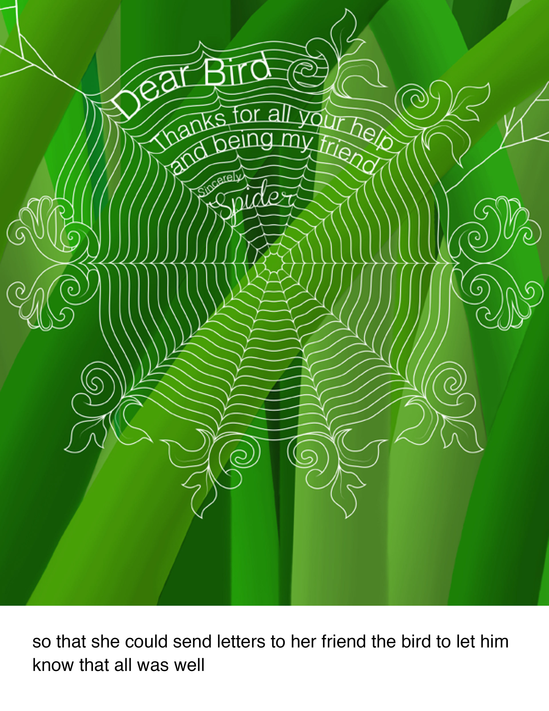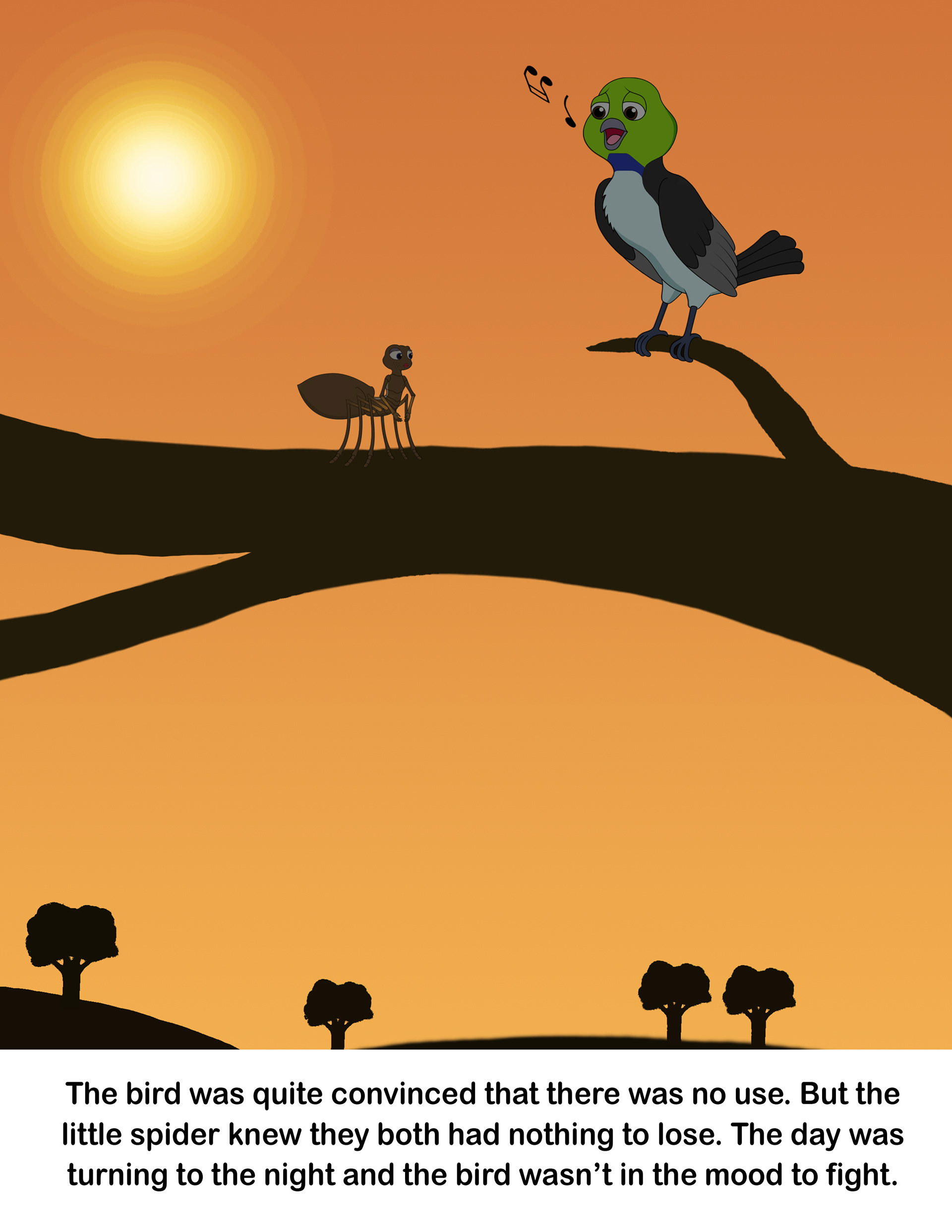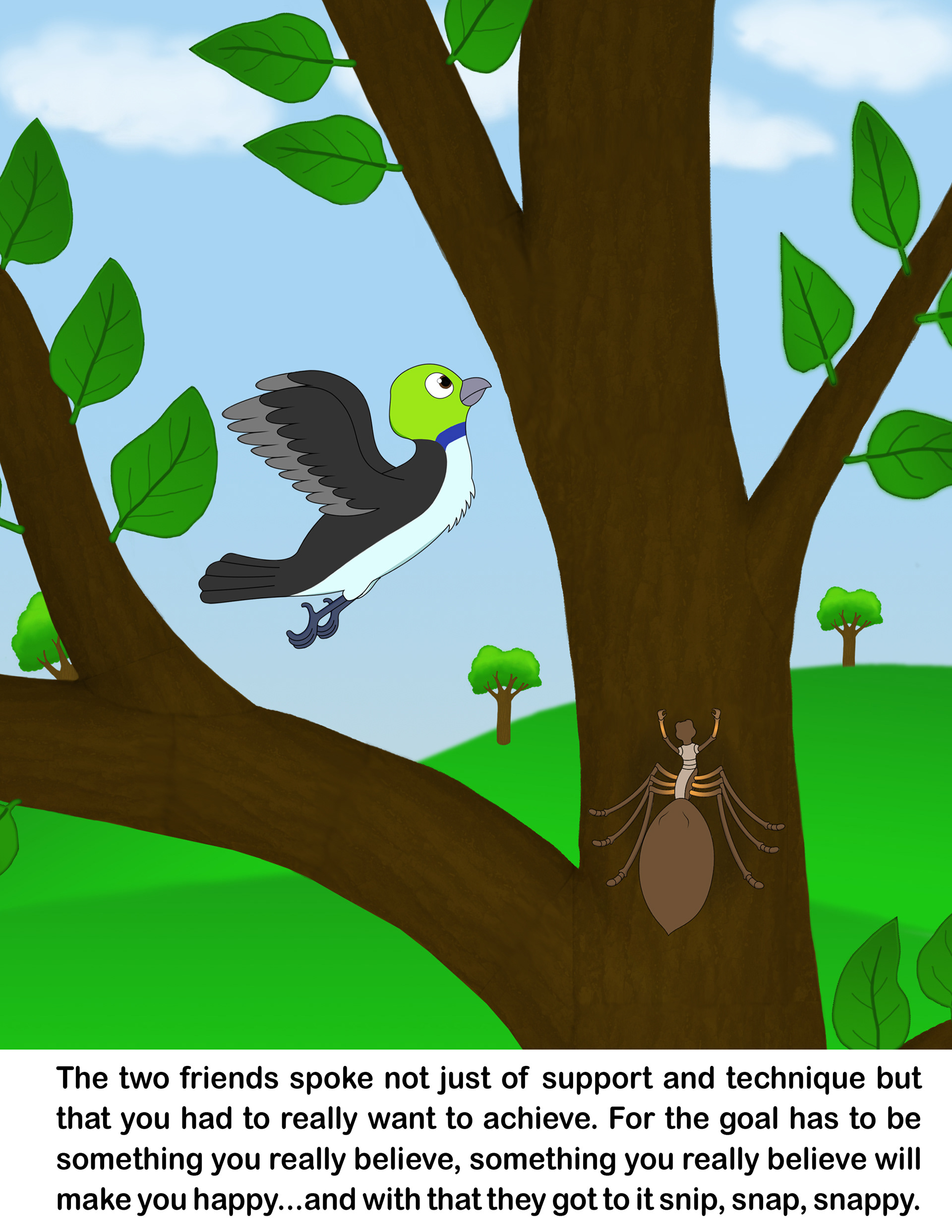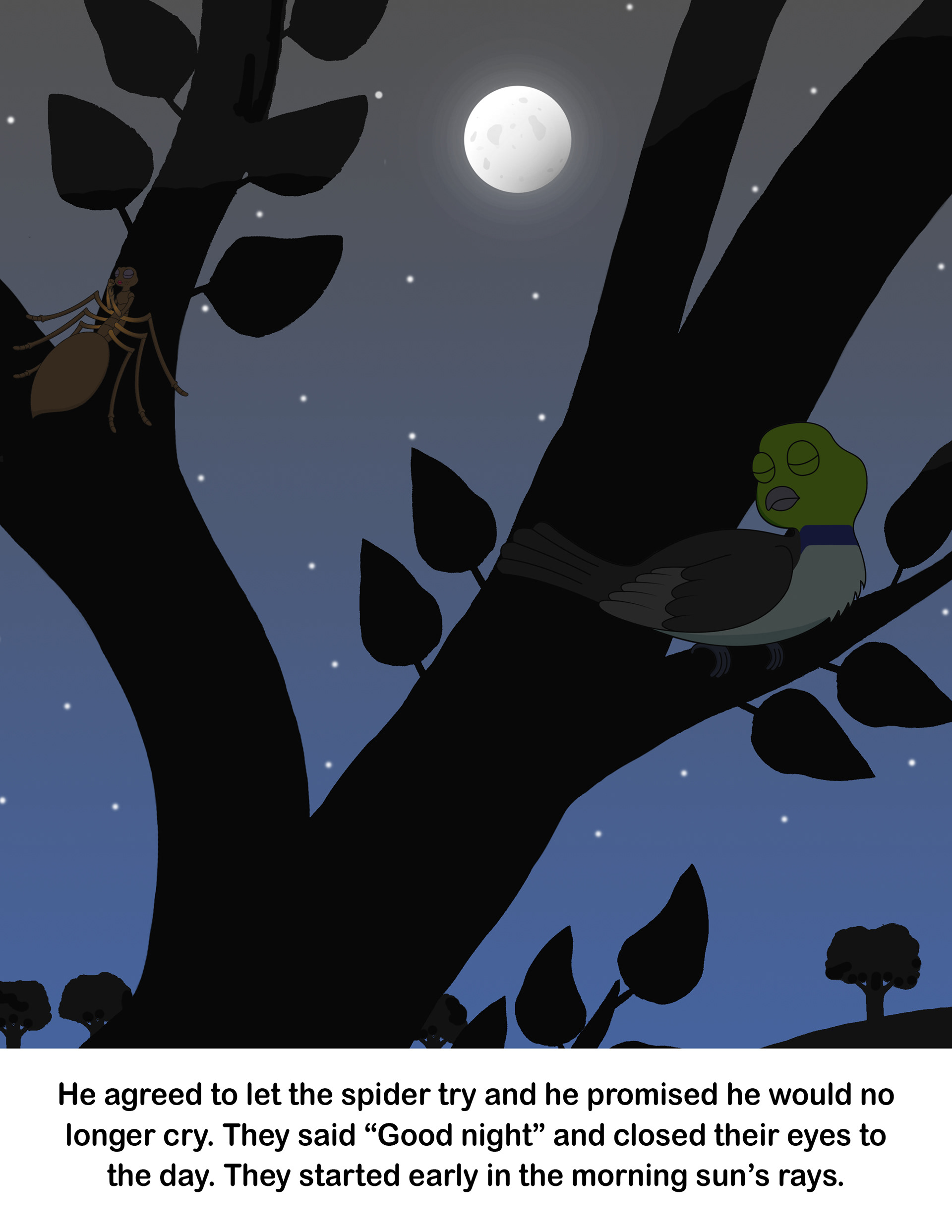 Created and illustrated all the characters in the story. The plot is based on a spider and a bird who help one another by learning how to solve each other's problems by becoming good friends.