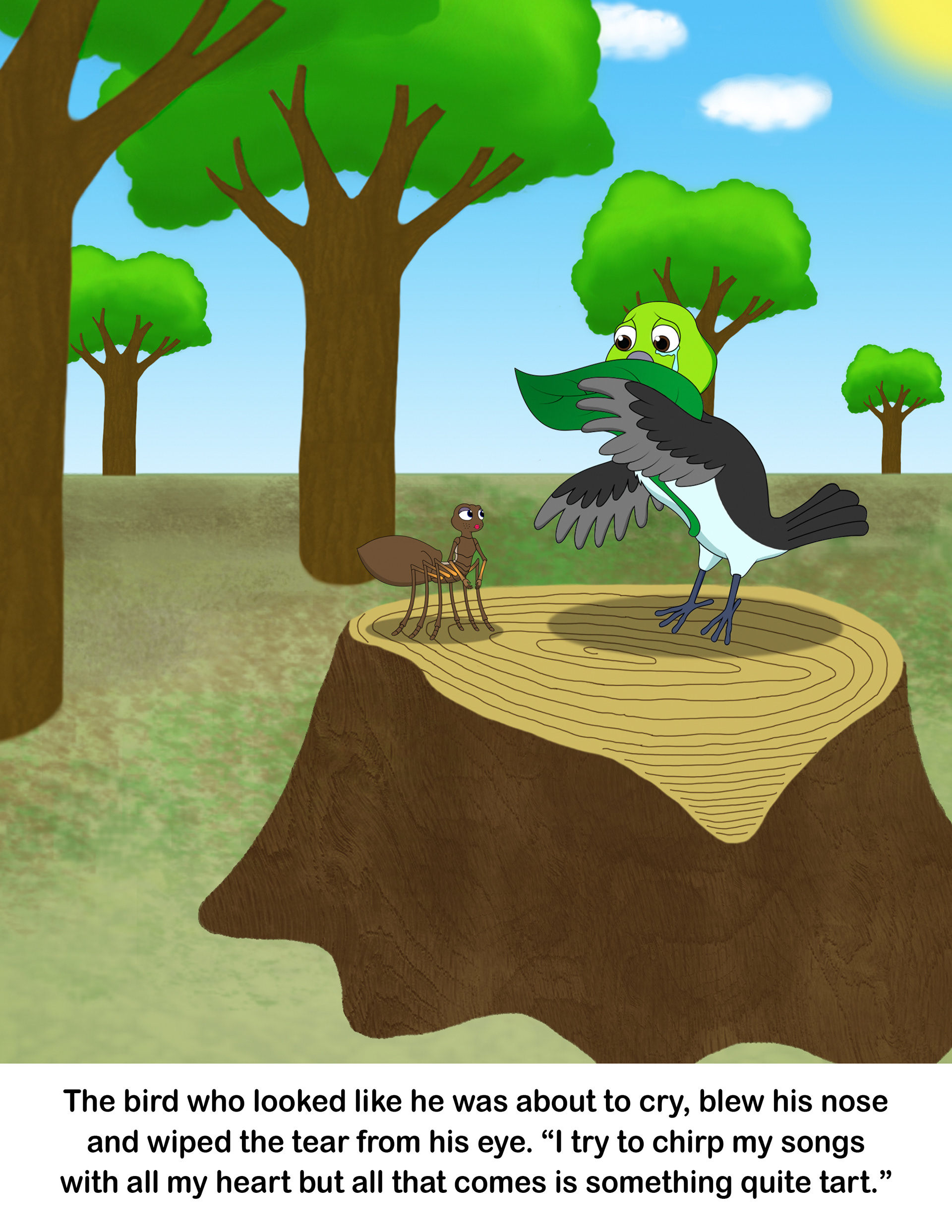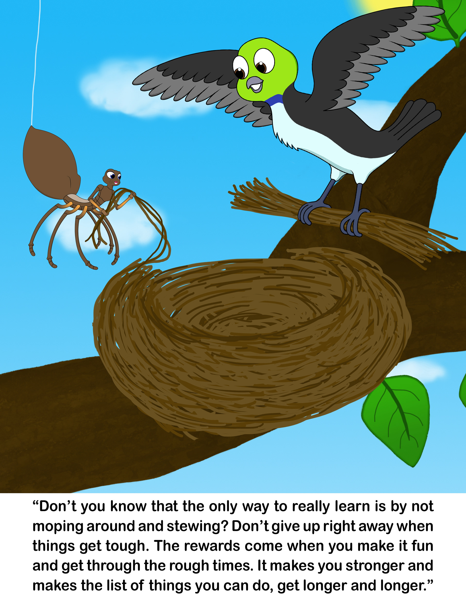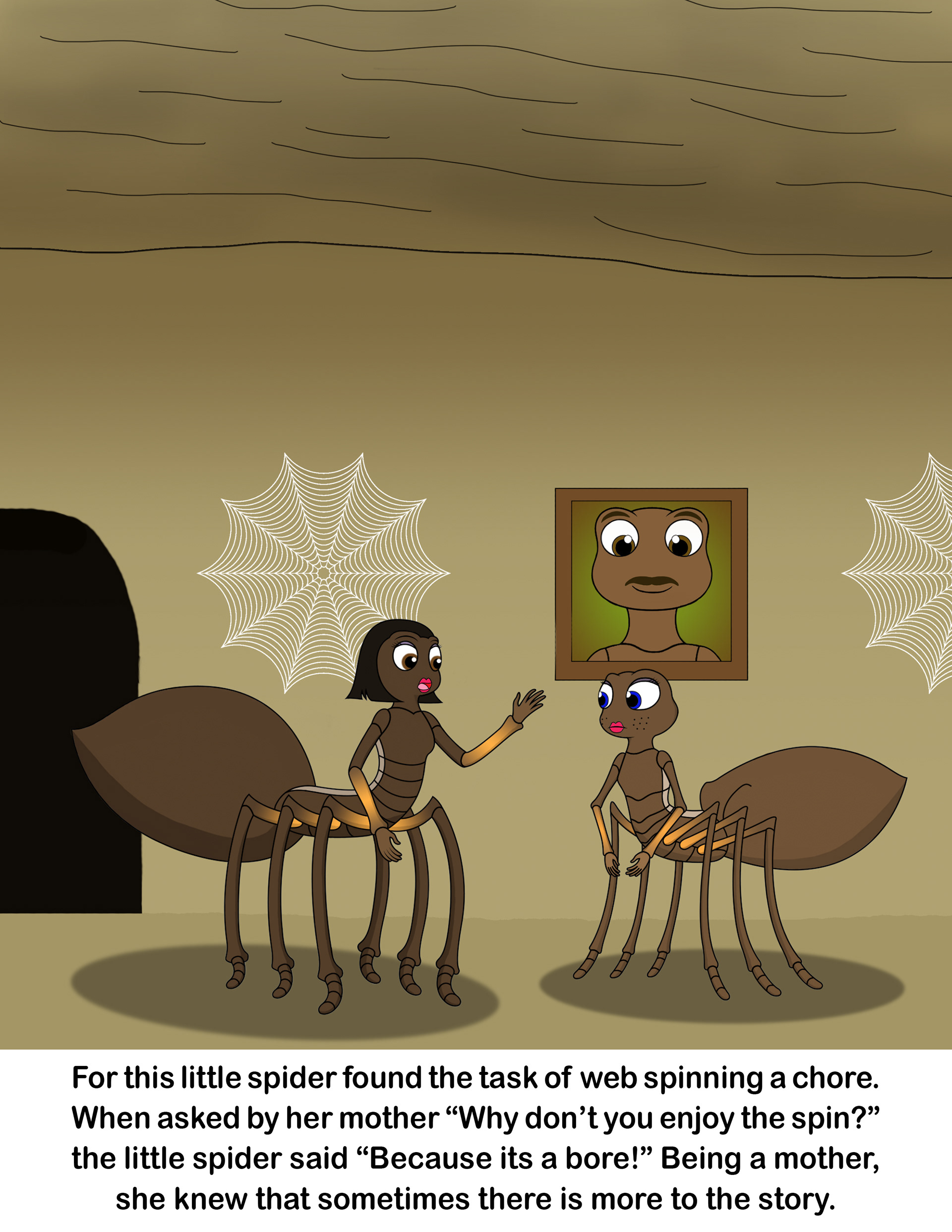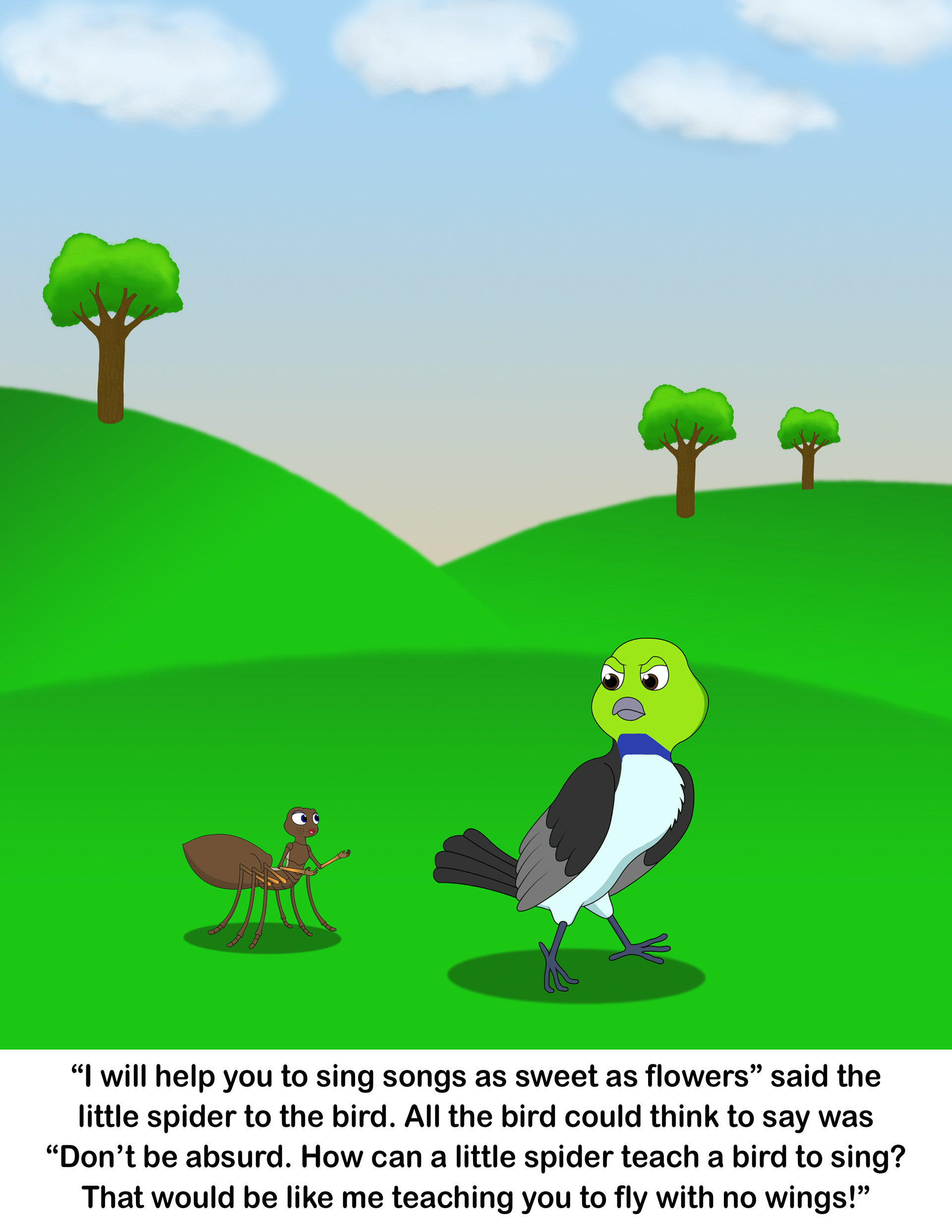 Created and illustrated all the characters in the story. The plot is based on a spider and a bird who help one another by learning how to solve each other's problems by becoming good friends.