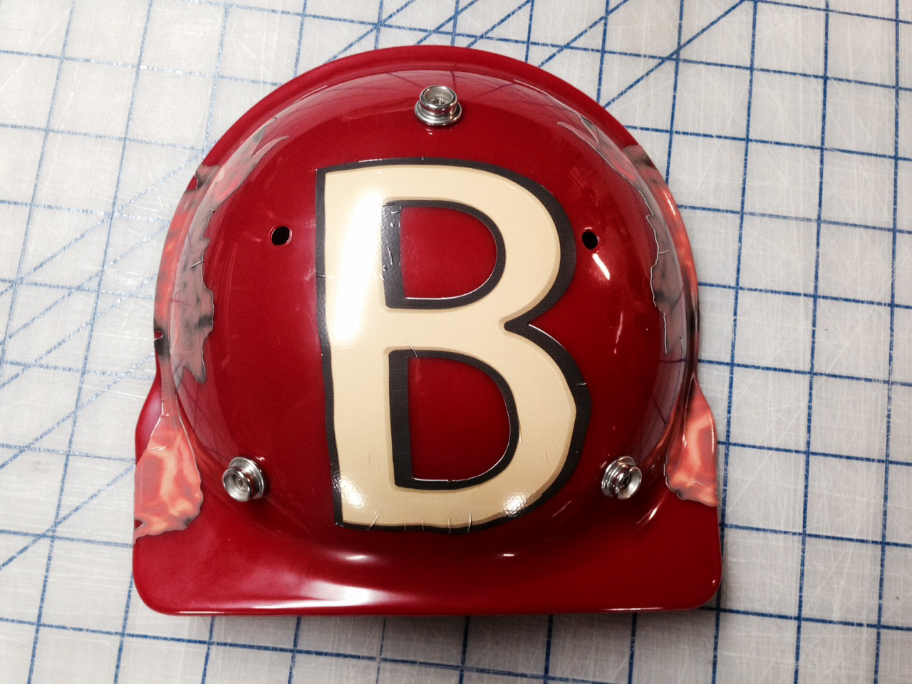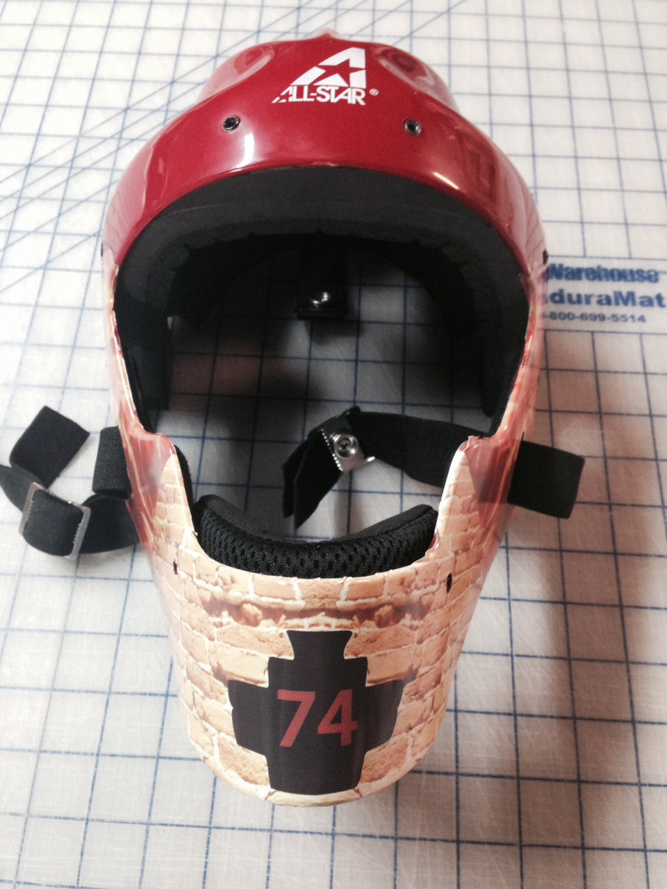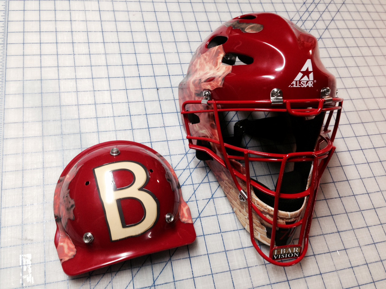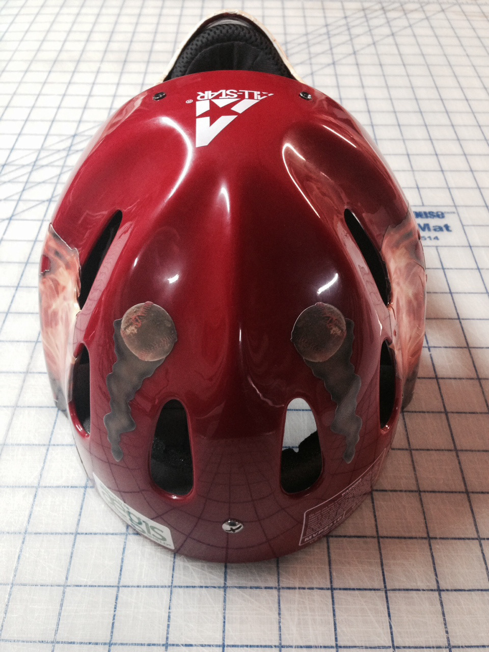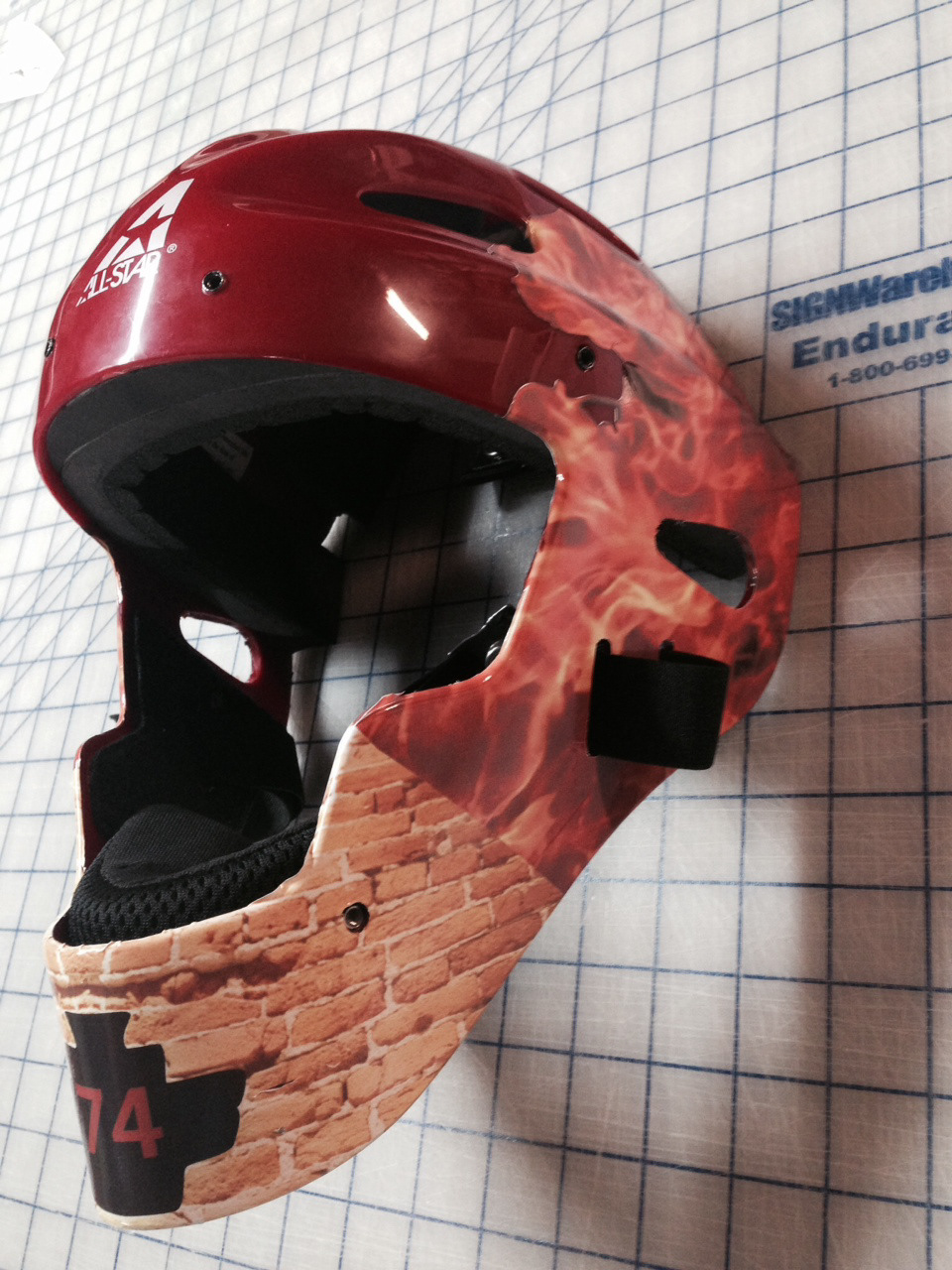 Designed a vinyl wrap for helmet, that included ascending flames, two smoking baseballs, a large number on back and a photo manipulated brick wall.